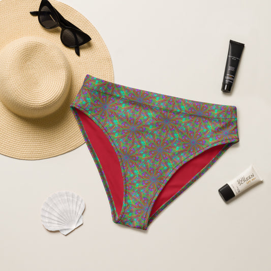 Red geometric star mandala pattern recycled high waisted bikini bottom