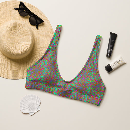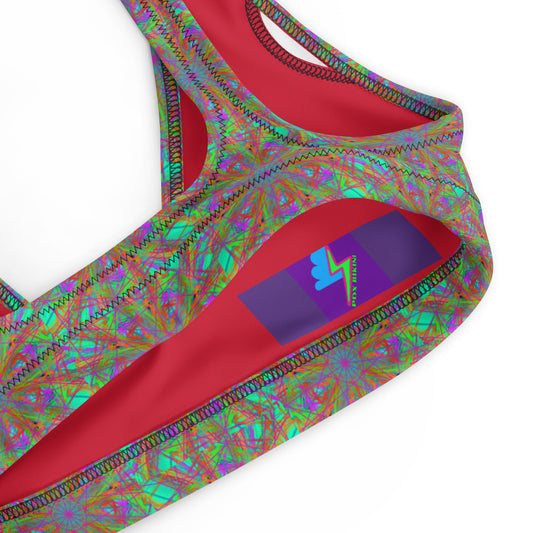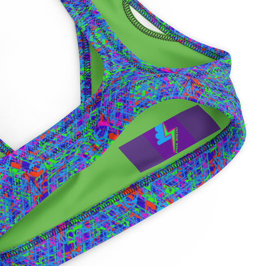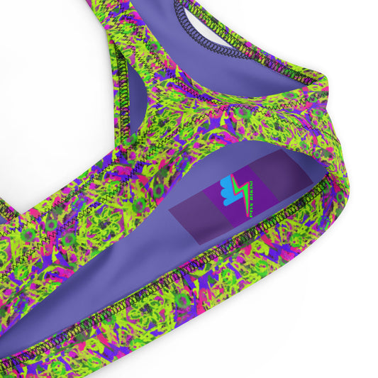 Neon yellowish green and purple geometric pattern recycled sporty bikini top