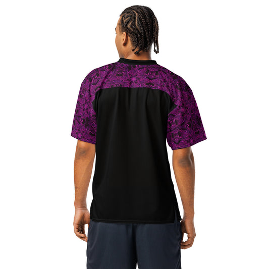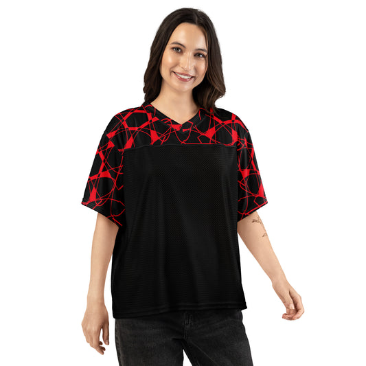 Boxy football jersey in black and red geometrics